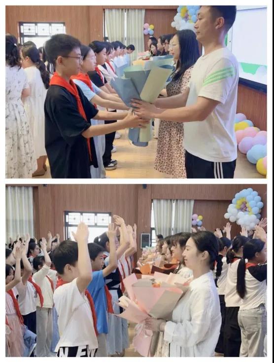 全体毕业生行谢师礼,毕业生代表手捧鲜花,缓步走向朝夕相伴的恩师。五六年级所学歌曲《清晨》和《茉莉花》串烧,如清风拂面,传递着对未来的憧憬。毕业生代表邱锦怡同学用朴实真挚的话语表达了对母校的感谢,分享了自己在鹿小的成长感悟与对未来的期许。校领导为每位毕业生分发毕业纪念册,这本承载着六年回忆的册子,将成为大家最珍贵的礼物。