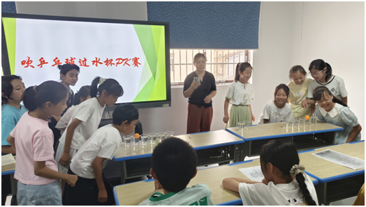 “吹乒乓球过水杯”游戏将课堂气氛推向高潮。学生以小组为单位,通过吹气控制乒乓球跃过水杯障碍。这项看似简单的游戏,实则暗含专注力训练、团队协作能力提升的深意。当胜利的欢呼与鼓励的掌声交织,孩子们在竞争中学会了互助,在失败中磨砺了韧性。