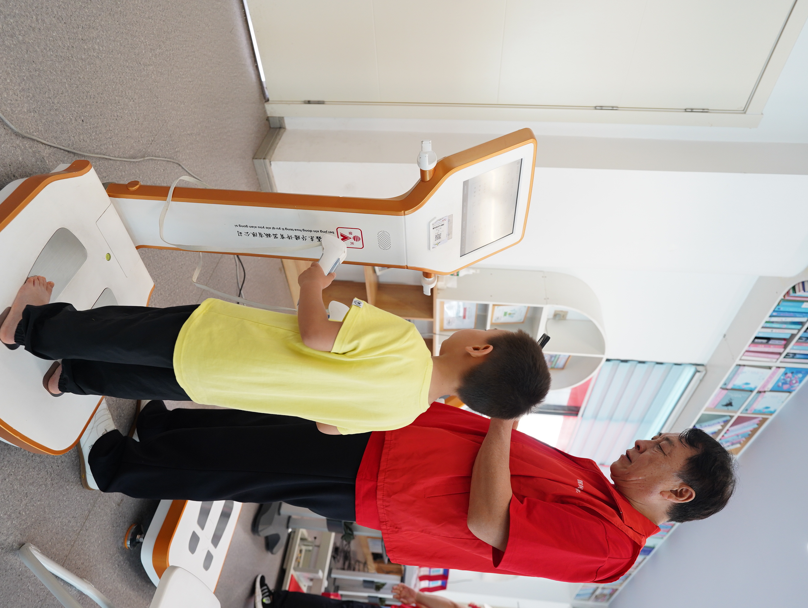 检测现场设置身高体重测量、坐位体前屈、立定跳远、15 米绕障碍跑等六大项目,从身体形态、机能、运动素质三方面为幼儿 “健康画像”。工作人员手持卡通量尺、趣味障碍物,让测评变成