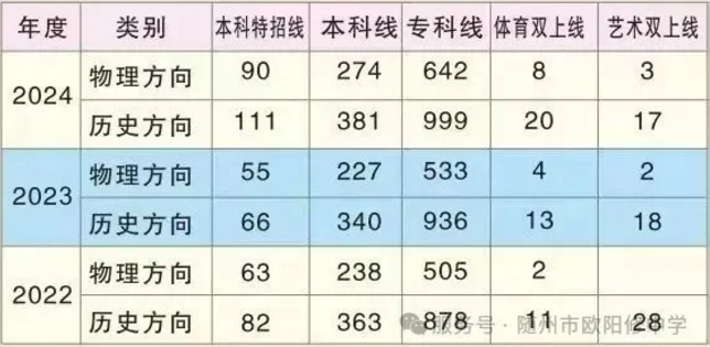 2022年,本科上线人数高达256人,过特招线55人,物理方向占随州市同类学校上本科线总数的57.95%,历史方向占随州市同类学校上本科线总数的48.83%,再次刷新纪录。