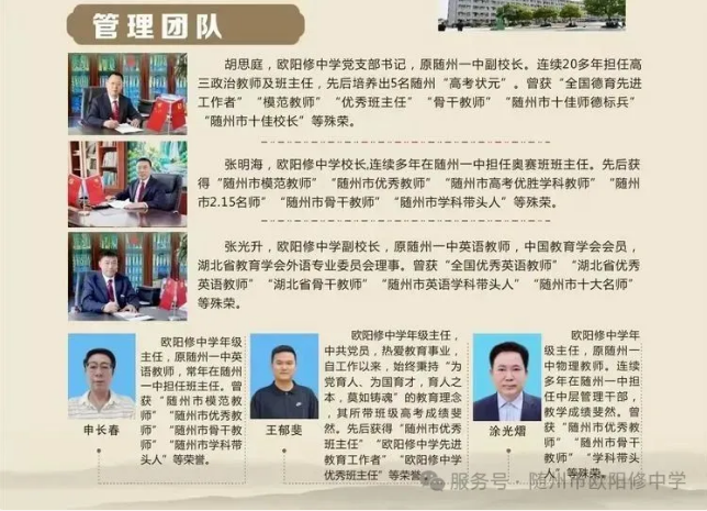 随州市欧阳修中学,创办于2004年秋季,地处氵厥水湖畔,与随州一中仅一巷之隔,作为与随州一中缔结的名校,学校始终坚持五育并举的教育理念,助力学生综合素养的全面提升,享受随州一中的优质教育资源。学校秉承“人为本、德为先、质为上”的办学理念,以“忠孝诚雅,坚毅自信”为校训,培养了大批具有高尚品德和卓越才能的学子。经过二十载的不懈奋斗,学校硕果累累,教育成果逐年稳步提高,本科升学人数与升学率持续在全市同类学校中遥遥领先,让同层次学生大面积升入本科院校, 圆了无数考生的升学梦,被随州市教育局评为“高考特色学校”,彰显出我校卓越的教育质量和实力,同时也赢得了社会的普遍赞誉与认可。