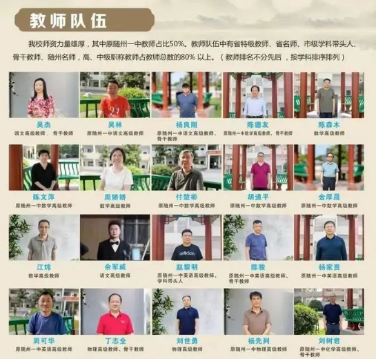 教学资源:学校拥有来自随州一中的正高级教师、特级教师、省级名师十余名,高级教师三十余名,教学实力雄厚。