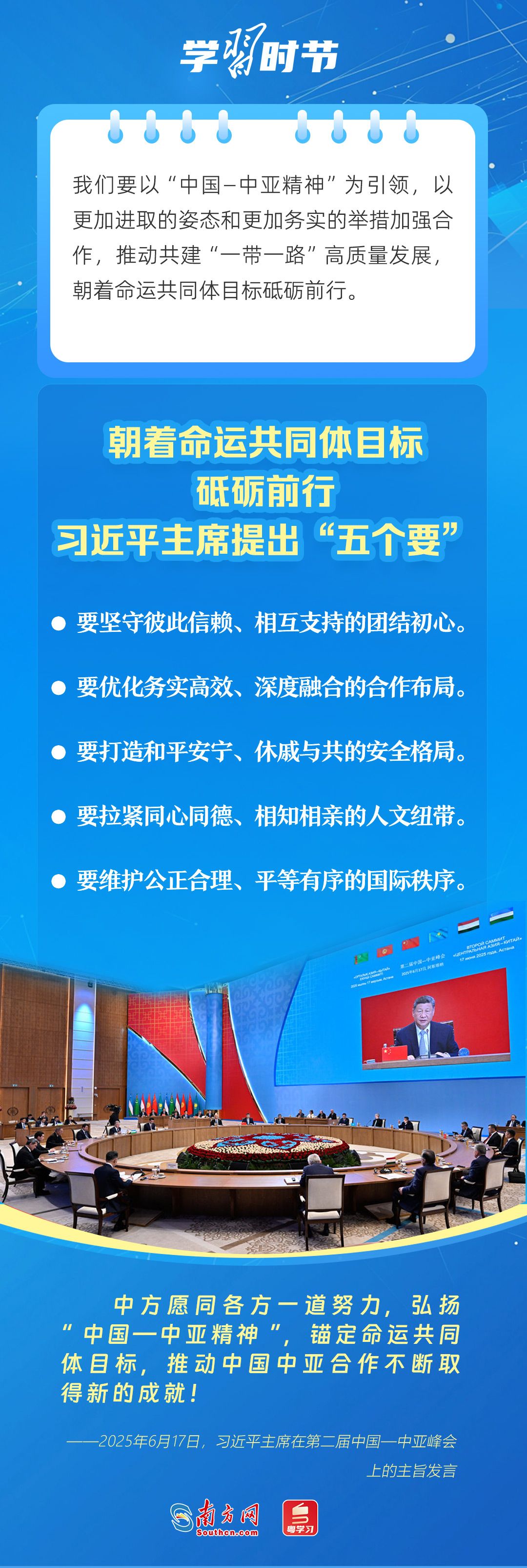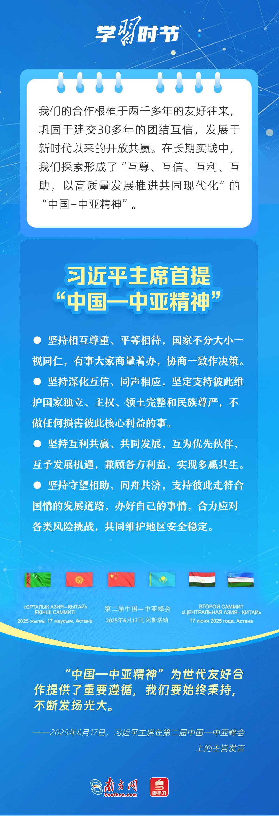 当地时间6月17日下午,第二届中国—中亚峰会在哈萨克斯坦首都阿斯塔纳独立宫举行。习近平主席在主旨发言中,首次提出“互尊、互信、互利、互助,以高质量发展推进共同现代化”的“中国—中亚精神”,为世代友好合作提供了重要遵循。