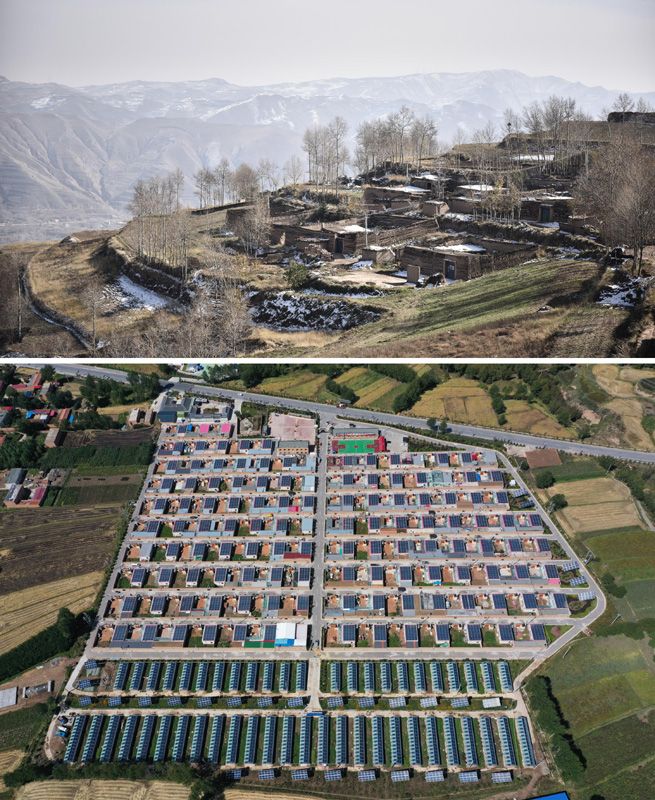 上图为2016年11月拍摄的脱贫前的青海互助土族自治县班彦村村貌,下图为2019年9月拍摄的青海互助土族自治县班彦新村村貌。