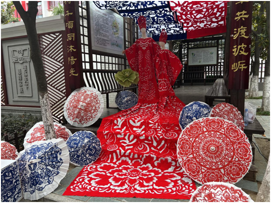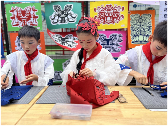 活动伊始,与会代表走进曾都区实验小学校园,浓厚的传统文化氛围扑面而来。“奇狮妙想迎嘉宾”、“国粹绽新芽”等节目表演瞬间吸引了大家的目光,特别是教联体各成员校学生的剪纸作品更让老师们赞叹不已。“用剪纸讲述随州青铜故事”“银杏情怀”“哪吒送祝福”等一幅幅作品线条流畅、让人震撼;明信片、九雅章等一份份剪纸文创作品构思精巧、让人爱不释手。这些作品生动展现了非遗文化在校园的传承活力。现场,剪纸社团的同学们正在进行创作,剪刀翻转、彩纸纷飞间,孩子们将天马行空的创意融入作品,他们还大方展示了自己设计的剪纸图案服装、头饰。