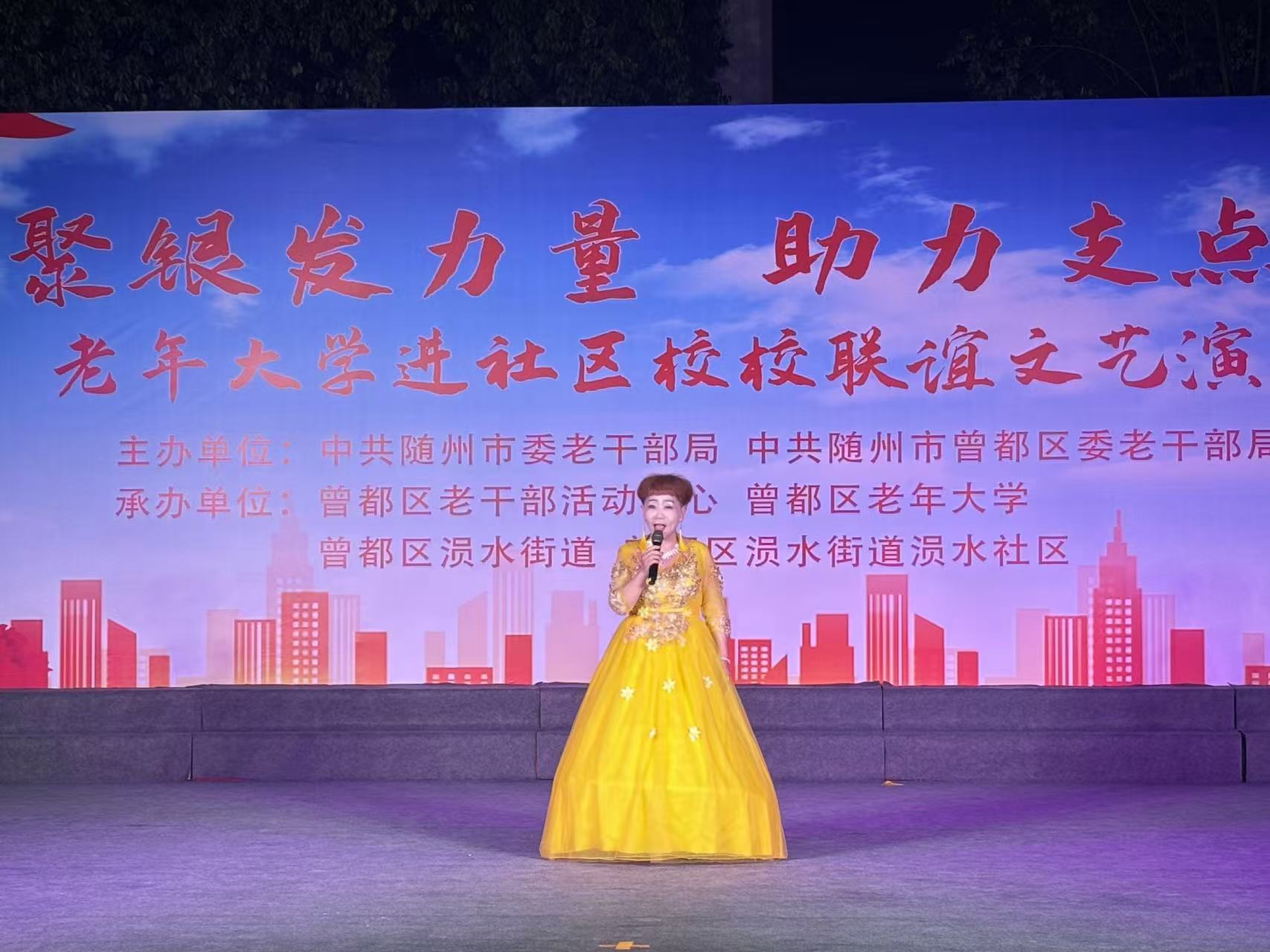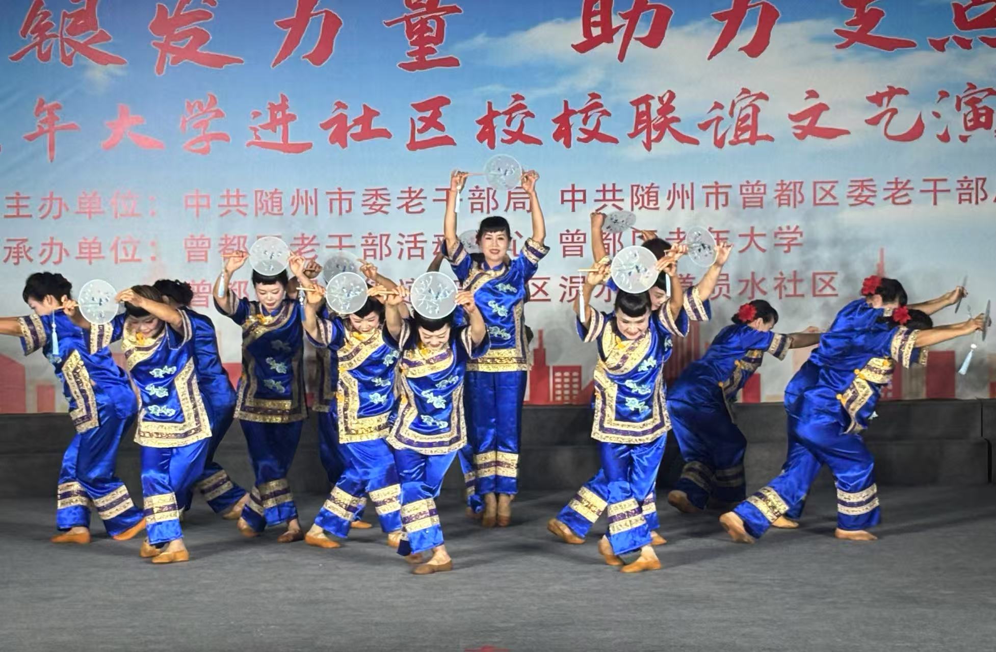 在精彩纷呈的文艺演出环节,涢水社区老年大学的学员们倾情表演12个精心编排的节目,充分展现“老有所学、老有所乐、老有所为”的精神风貌。活动由随州市委老干部局、曾都区委老干部局、曾都区老年大学、涢水街道及涢水社区共同承办。