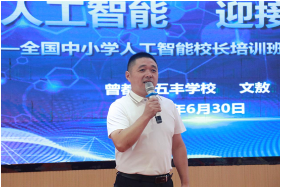 培训伊始,五丰学校党支部书记、校长文敖以《拥抱人工智能 迎接未来教育》为题作开幕讲座。文校长从人工智能时代“政策形势解读”、“教育方式变革”、“教师应对策略”三个层面,阐述了教师需主动适应技术变革,将AI工具转化为教学提质、管理增效的“新引擎”,为教联体高质量发展筑牢根基。