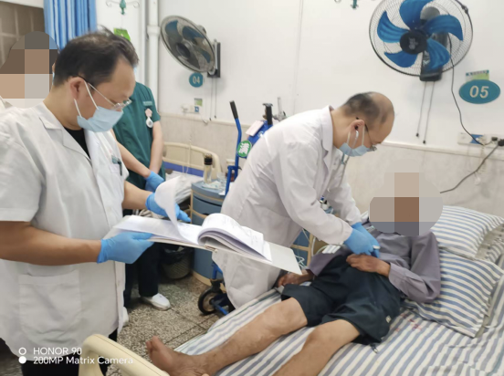抵达何店镇中心卫生院后,专家团队片刻未歇,立即投入紧张的会诊工作。张文汉带领团队严谨细致地询问患者病史、进行全面体格检查、深入查阅病历资料,结合临床信息深入分析病情,最终考虑该患者诊断为“发热伴血小板减少综合征”。针对这一病症,专家团队详细阐述了诊断依据,并就治疗方案给予了专业、系统的指导,让该院医务人员对该疾病的诊疗有了更清晰的认知。