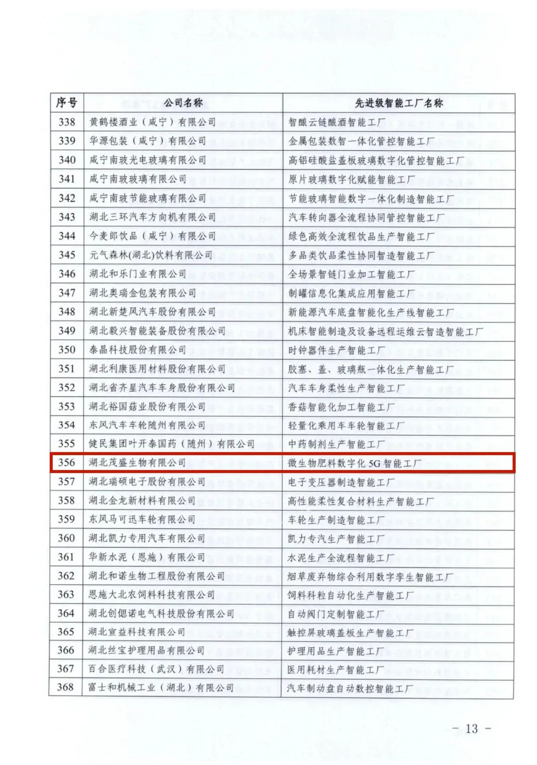 7月14日,湖北省经济和信息化厅公布智能工厂梯度培育2025年度第二批先进级智能工厂名单,湖北茂盛生物有限公司入选湖北省先进级智能工厂。