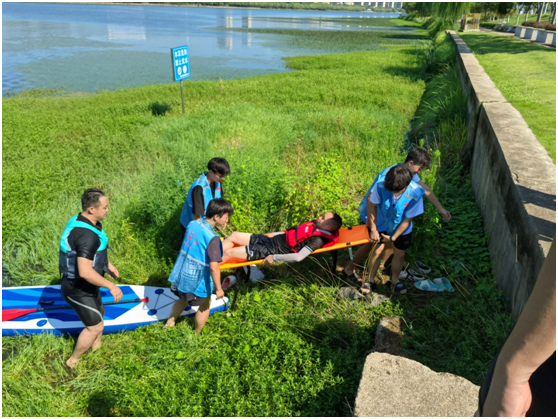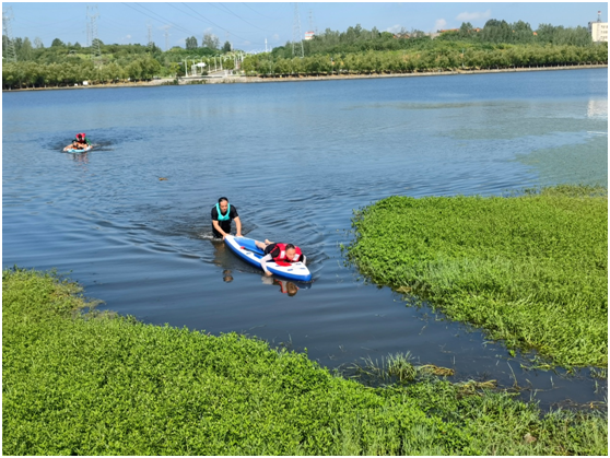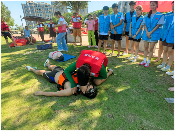 演练聚焦实战需求,精心设置了三个救援场景:单人落水快速响应、暴雨中双人溺水骨折协同施救及心跳骤停紧急复苏。在红枫志愿队的协调保障下,12名救援队员分工明确、配合高效——岸基组精准抛投救生设备,浅水组勇毅入水拖带转运,医疗组娴熟实施心肺复苏(CPR)与AED急救。全体人员严格遵循安全规范,重点演练了“岸基-浅水”协同、黄金4分钟急救及复杂场景团队处置能力。红枫志愿队全程协助组织、维持秩序、保障物资并关注人员安全,严格落实高温防护,演练后进行了复盘总结。