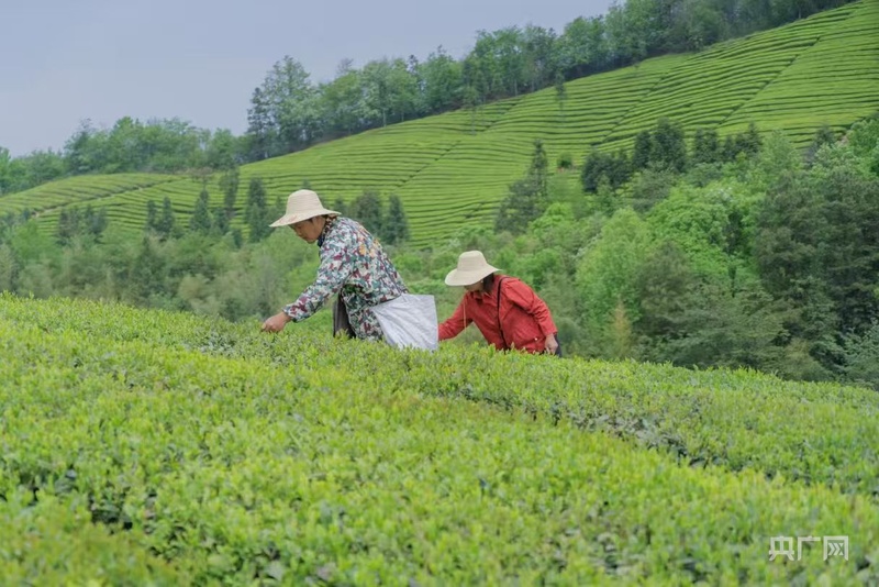 茶农在宜红生态茶园采摘茶叶(央广网记者邓子依 摄)
