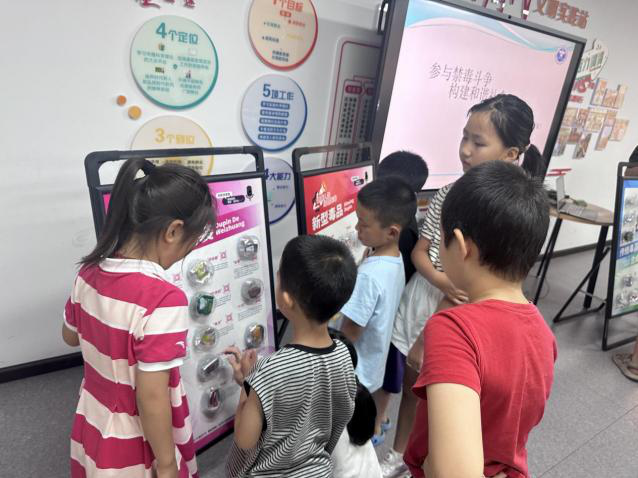 活动中,禁毒知识变得生动有趣。志愿者以“有害物质的变身术”进行讲解,传统有害物外观可能很普通,却能被制成极具危害的物质;另一种粉末状有害物看似寻常,实则危害巨大。人工合成有害物则被比作“彩色药片的陷阱”,有的像日常的冰糖或糖果,有的印着卡通图案,有的包裹着鲜艳的糖纸,会伪装成“零食”的模样。在“识破伪装大师”环节中,志愿者展示了伪装成卡通贴纸、流行小零食包装、普通电子烟油等形态的有害物质,孩子们积极抢答并识别出这些都是经过伪装的有害品。通过观察学习,孩子们掌握了辨别技巧:没有正规厂家标识的“零食”不碰、对陌生人给的饮料保持警惕、气味怪异的“香料”可能是危险品。