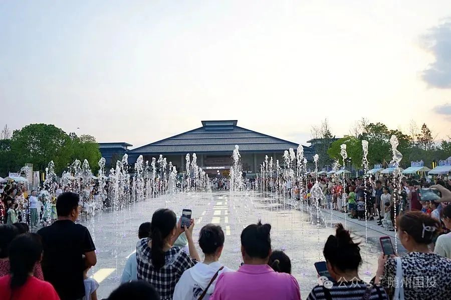 当晚,“炎之有礼·首届古风文博市集”也在随州博物馆前广场启动,广场中央的旱地喷泉秀在光影映寸下十分梦幻,每次开启都围满了举着手机拍照的市民。