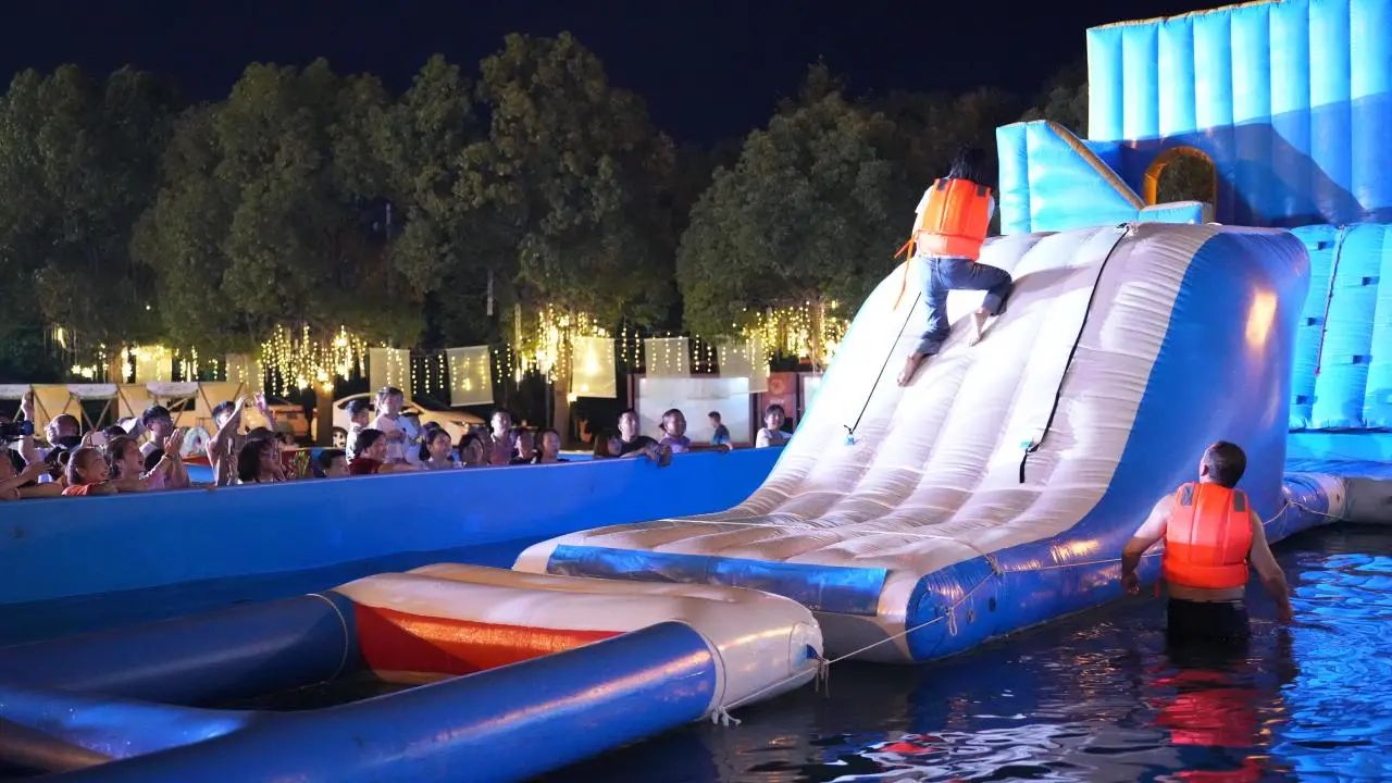 在大洪山景区,从7月12日启动的水上闯关活动持续。55米水上赛道设有8道关卡,吸引了大批爱挑战的年轻游客。