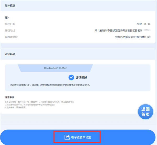 第二步:绑定成功后,选择需要查验的儿童,点击“入学查验证”进行查验。查验显示“评估通过”,请点击“电子查验单导出”,保存图片并自行打印,报名时提交学校或托幼机构。查验显示“评估未通过”,请到就近预防接种门诊补种漏种针次,完成后再查验,导出电子查验单。