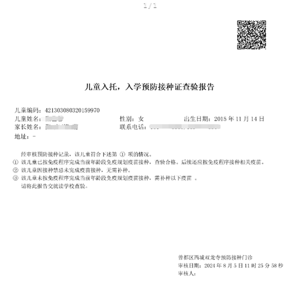 《查验报告》作为儿童入托入学报名时需提交的一项内容,请监护人妥善保存,开学时及时上交托幼机构或学校。