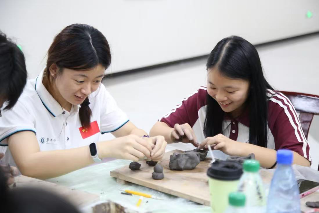 实践队充分发挥体育人优良品德,将团队协作、追求卓越等体育精神内核融入美育实践。活动伊始,美术馆专业讲解员带领学员们赏析经典书画作品,通过“艺术小讲堂”生动解读中国陶瓷文化的历史脉络与工艺精髓,并结合趣味有奖竞答激发学习热情。在陶艺制作环节,专业教师现场演示非遗“泥条盘筑法”技艺,实践队员采用分组教学法指导学员完成创作,将体育中的集体观念、规则意识、目标管理融入创作过程,促进学生发展集体荣誉感和责任意识。