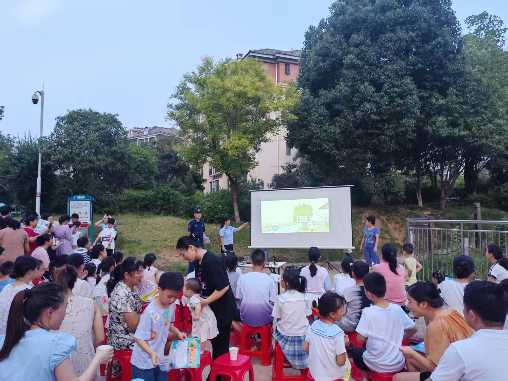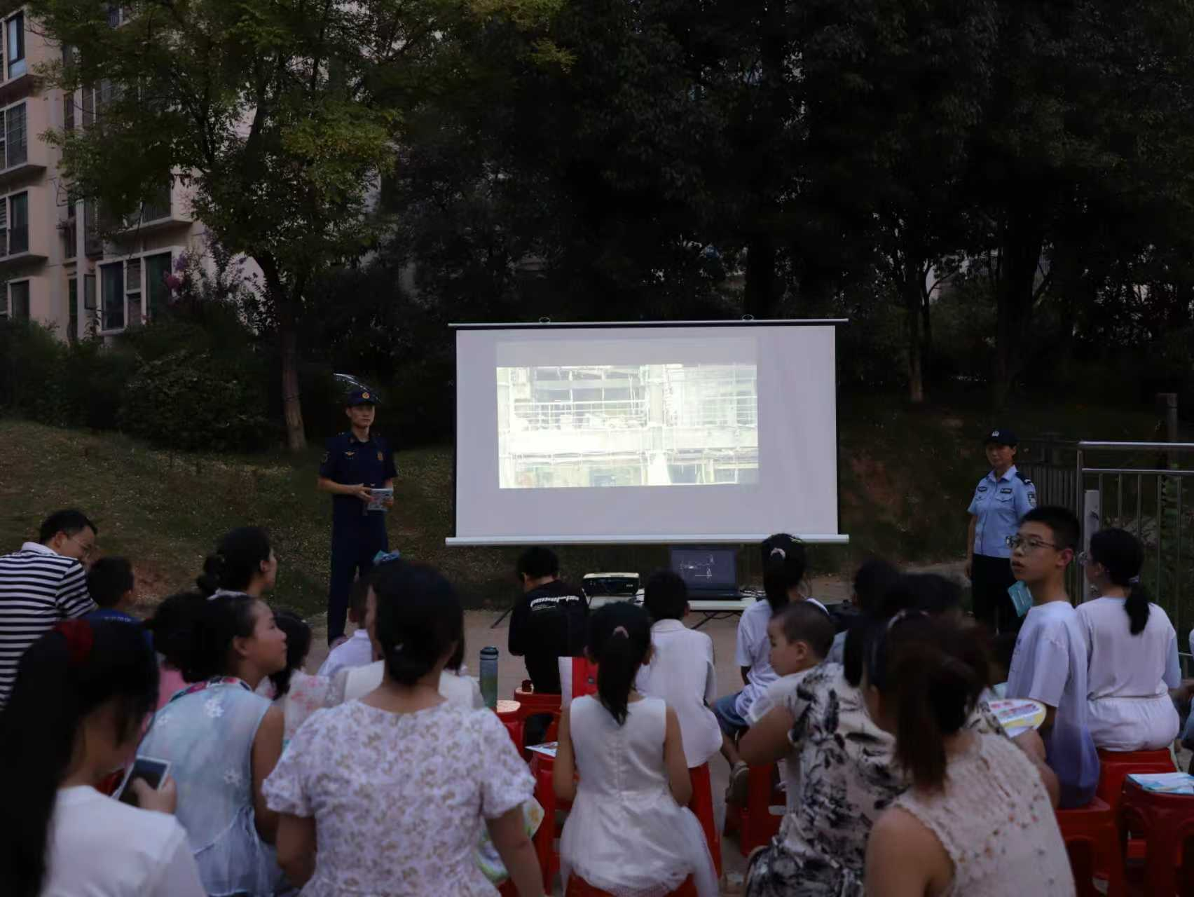 近日,风光社区碧桂园云山竹语小区广场热闹非凡,一百余名居民在此纳凉观影。涢水派出所联合随州市消防救援支队、风光社区及碧桂园物业,开展安全知识进社区活动,将反诈、消防和防溺水三大安全课堂融入露天电影放映,为居民送上“安全大礼包”。