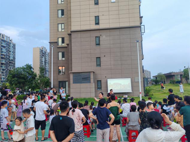 一块白色幕布,一台放映机,将居民聚集在一起,大家摇着蒲扇、围坐观影,享受着邻里相聚的惬意时光。