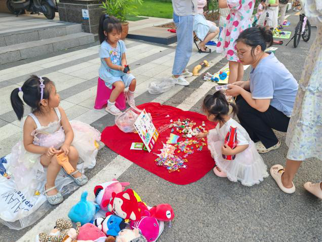 本次夏日狂欢活动精心打造三大亲子互动专区,让大小朋友尽享欢乐时光。在“星空影院”专区,近百个家庭席地而坐,在璀璨星空下重温《哪吒之魔童闹海》,孩子们为哪吒的冒险惊呼连连,大人们摇着蒲扇回忆童年露天电影时光。“水枪大作战”区域化身为清凉战场,父子兵、母女档配合默契,欢笑声此起彼伏。最富教育意义的当属“小掌柜市集”,30多位小摊主用玩具、图书搭建起迷你商业街,7岁的乐乐用旧玩具换到心仪的绘本后兴奋地说:“我学会讨价还价啦!”