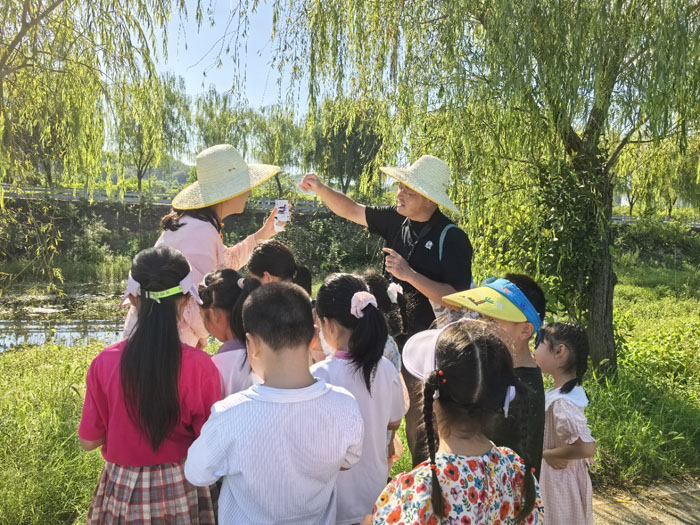 活动中,孩子们手持望远镜深入湖畔、田地、密林,邂逅了多种鸟类。廖雨蒙同学率先发现“小宝石”普通翠鸟,大家静静观察其“守株待兔”的捕食模样;当林中彩虹“仙八色鸫”现身时,其身上蓝、绿、红、栗等八种色彩让孩子们惊叹,曾老师介绍这是国家二级保护动物,珍稀又美丽。