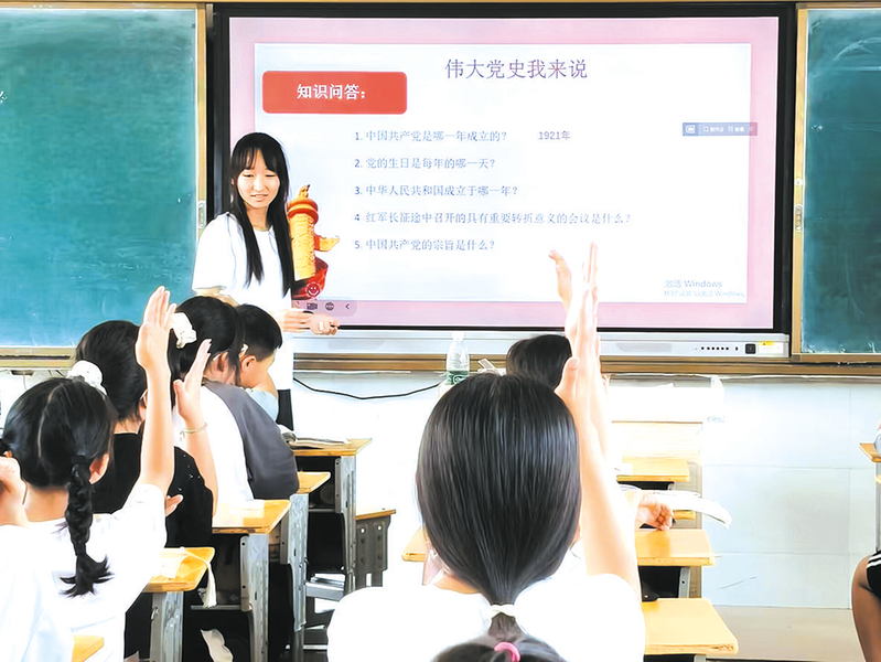 近日,随县洪山镇一中“爱心托管”班内,三堂别开生面的红色思政课接连开讲。湖北第二师范学院“四叶草”青年志愿服务队的志愿者们,将暑期社会实践与思政育人深度融合,引领学子们触摸历史脉动,感悟信仰力量,让红色基因融入学子青春坐标。