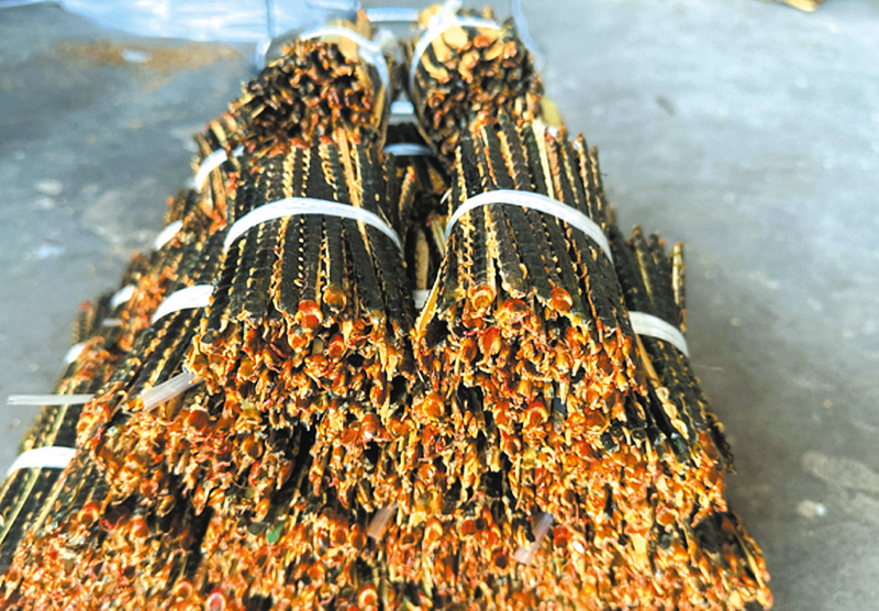 走进三元公司,成堆竹竿引人好奇,答案藏在分拣车间:每条蜈蚣腹部紧贴细竹片,密密麻麻的脚将其紧紧抱住。“这样晒干不会断,能减少分拣、运输损耗。”龚大友解释道。
