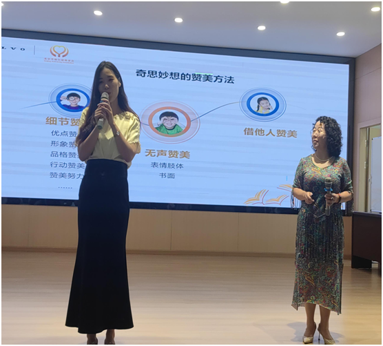 团辅环节,王老师以“拍拍操”热身活跃气氛,随后通过“基础赞美—抽签练习”让教师感受赞美力量,又详解“三重赞美”“三明治赞美”等高阶技巧,并借助情景模拟、角色扮演引导实践。活动尾声,王老师还发起赞美打卡活动,倡议教师将技巧用于班级教学,让赞美成为习惯。