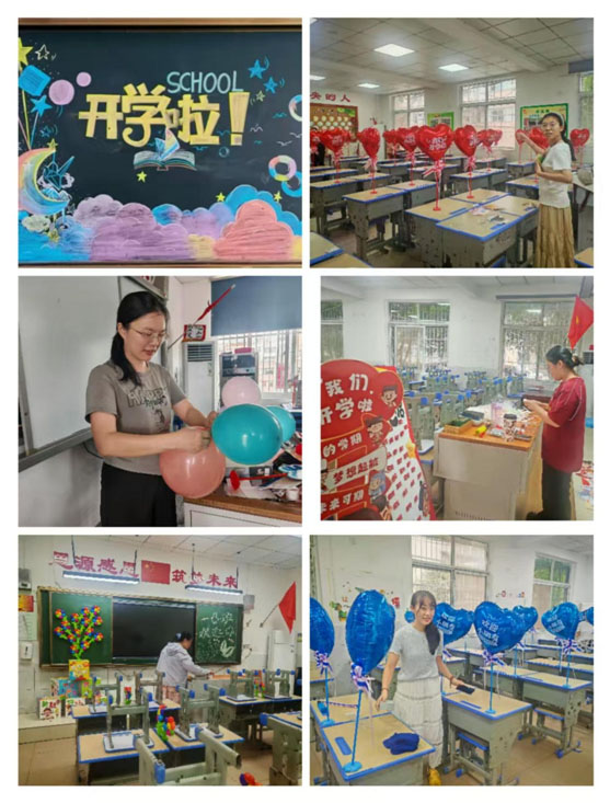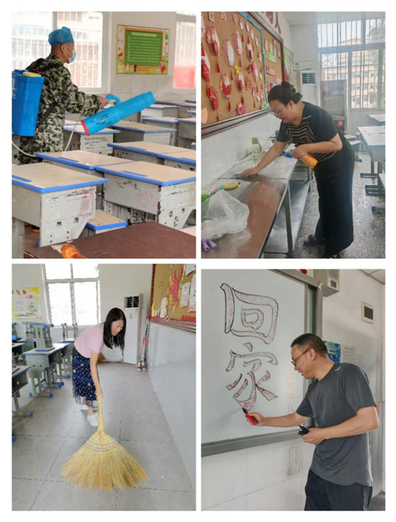 在各教学楼、走廊,保洁员们正拿着抹布、水桶 “作战”,墙壁、走廊擦得干净光洁,楼梯转角、扶手都被反复擦拭消毒。各教室里老师们通力协作,地面干干净净、桌椅摆放整齐、玻璃擦得透亮。一年级各班以喜庆温馨的装饰和满满的仪式感迎接萌娃报到;其余各年级有心的班主任各显其能,让久别的教室充满对孩子们回归的呼唤和对新学期的畅想。