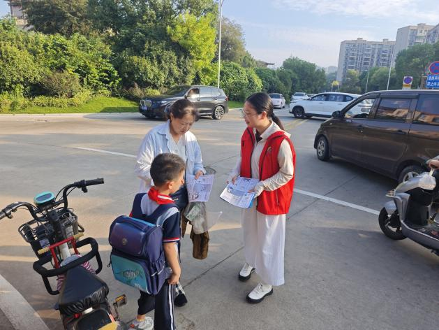 “小朋友,过马路要注意安全哦!”现场,一名志愿者弯腰对正准备过马路的小学生耐心讲解安全通行要领。护学队伍不仅守护学生通行安全,还积极向接送学生的家长普及交通安全知识,强调驾乘电动车、摩托车佩戴头盔的重要性,增强家长和学生的自我保护意识。