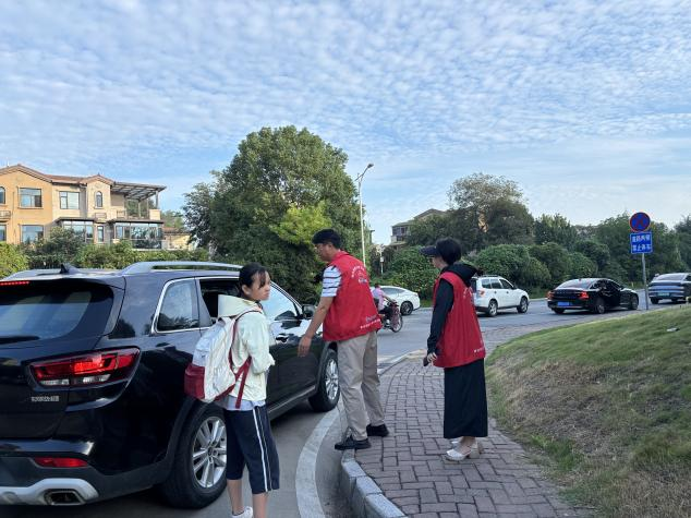 活动中,志愿者身着“红马甲”在校门周边主要路口和路段,有序疏导车辆,引导学生安全过马路,提醒家长即停即走,有效缓解开学日高峰时段的交通压力,确保校园周边道路畅通、行人安全。