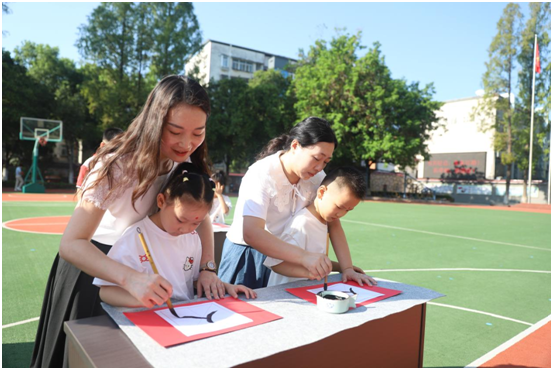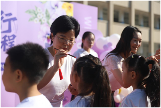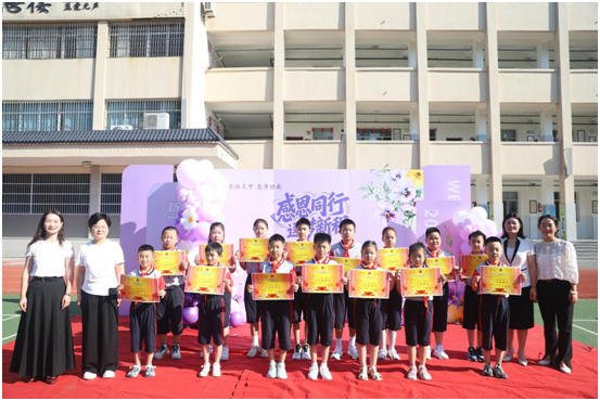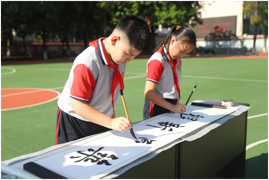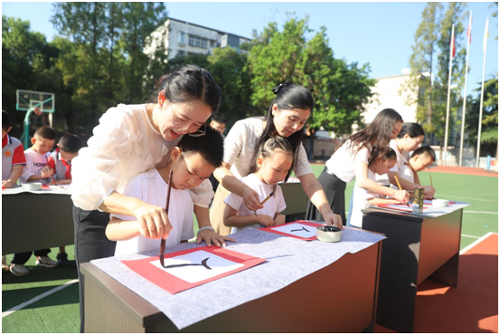接着,少先队员进行献词和感恩宣誓。他们激情澎湃的话语,表达了对祖国的热爱、对学校的感恩以及对未来的憧憬。一年级新生入学礼是典礼的重要环节。朱砂启智,校长和老师们为新生点上朱砂,祝福孩子们开启智慧、目明心亮。新生们向老师拜师敬礼,行开笔启蒙之礼,书写 “人” 字,寓意着从此开启求知成长新旅程。