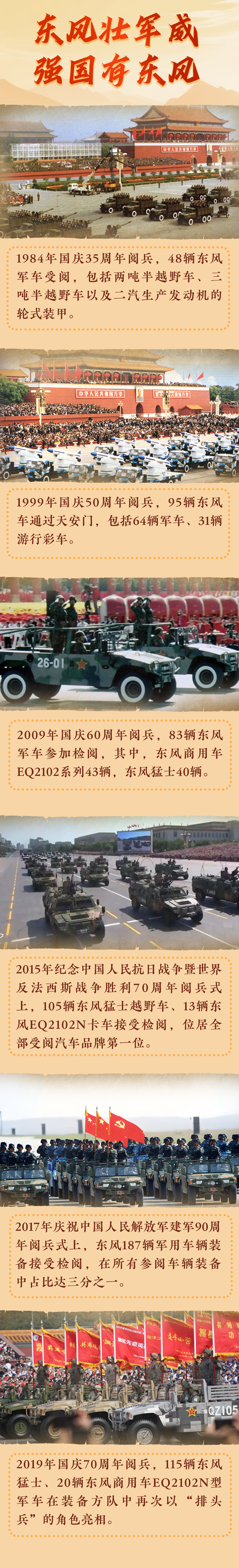 东风因军而建、因军而兴、因军而荣。在过去的四十多年,东风军车已经6次光荣接受党和人民检阅,创造着“零失误、零误差、零故障、零事故”的传奇纪录。