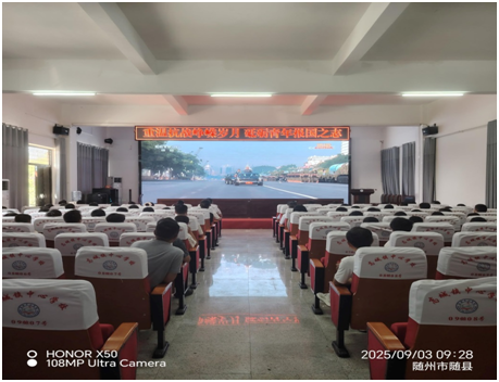 八十载风雨兼程,八十载砥砺前行。上午9时,北京天安门广场上,纪念中国人民抗日战争暨世界反法西斯战争胜利80周年大会正式举行。中共中央总书记、国家主席、中央军委主席习近平发表重要讲话并检阅部队。这一刻,全国人民的心都聚焦于此,高城镇的教育工作者和学生们也不例外。