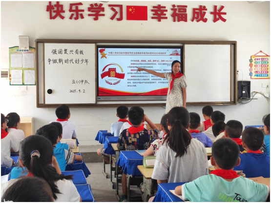 老师还解读了抗战胜利 80 周年纪念活动标志,其独特设计蕴含深厚历史意义,象征着中华民族团结抗争的精神。学生们认真记录,生怕错过细节。观看 93 阅兵精彩片段时,学生们了解到阅兵不仅展示军事力量,更是对抗战精神的传承与弘扬,心中爱国强军的种子悄然种下。