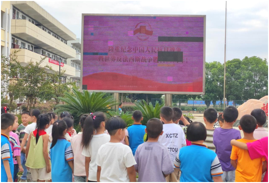 9月3日,校园电子屏成了爱国窗口。“铭记抗战历史,传承红色基因”“弘扬抗战精神,共筑中国梦想”等标语滚动播放,在阳光下格外醒目。课间,学生们驻足阅读,小声讨论,有的还向老师请教生僻字。这温馨一幕,让爱国情怀在校园里静静流淌。
