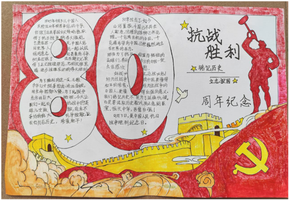 学生们不仅用言语表达着内心的感悟,还以笔为刃、以纸为疆,精心绘制了手抄报。那一幅幅手抄报,或色彩明艳,勾勒出抗战英雄的飒爽英姿;或文字铿锵,诉说着对祖国的无限热爱。学生们纷纷表示要铭记历史,珍惜当下的幸福生活,努力学习为祖国贡献力量。“我要发明先进武器保卫祖国!”“我要当医生救死扶伤!”孩子们的梦想纯真而坚定,如同夜空中最璀璨的星辰。