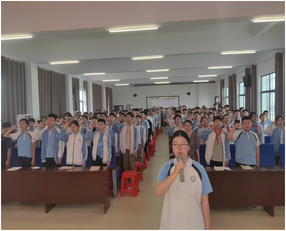 活动当天,小学部率先举行升旗仪式,师生肃立迎国旗,国旗下讲话传递抗战精神;随后全校同步观看九三阅兵直播,受阅部队的威武风貌点燃师生民族自豪感。各班级还召开主题班会,通过史料与视频回顾峥嵘岁月,引导学生厚植家国信仰;四至九年级学生同步开展观后感写作,以文字抒发爱国情。此外,九年级毕业年纪专门召开“阅兵观礼暨毕业班动员会”,金彦俊校长以阅兵精神为引,激励学子学纪律、强意志、明目标。随后,学子集体庄严宣誓,让爱国情与奋斗志在毕业班学子心中同频共振,为即将到来的中考征程吹响嘹亮号角。