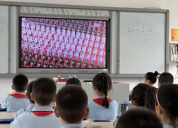 师生们早早地聚集在教室,怀着激动的心情等待阅兵式开始。当阅兵方队迈着整齐的步伐走过天安门广场,先进的武器装备一一亮相时,教室里不时传来阵阵惊叹声和掌声。