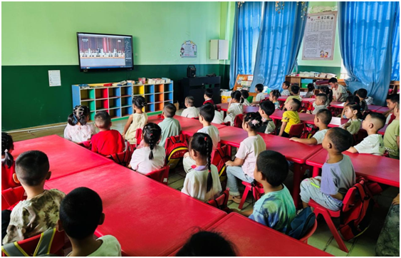 上午9时,庄严肃穆的纪念大会正式开始。雄壮的国歌声在各校园响起,全体师生肃立致敬,表达对伟大祖国的无限热爱和对革命先烈的深切缅怀。从中学到小学,再到幼儿园,尽管年龄不同,但孩子们的脸上都写满了专注与崇敬。他们跟随直播镜头,一同回顾那段烽火连天的峥嵘岁月,感受胜利的来之不易与和平的珍贵。