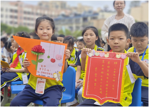 随后,温馨感人的“献礼致敬”环节将典礼推向高潮。各班学生代表向全体老师献上了精心自制的感恩贺卡。在动人的《感恩的心》旋律中,全体学生高高举起手中的感恩之花,瞬间汇成一片绚烂的“花海”。在音乐老师王一涵的指挥下,全校师生齐唱校歌,歌声嘹亮,情真意切。最后,全体学生起立,向辛勤耕耘的老师们深深鞠躬,并齐声高呼:“老师,您辛苦了!谢谢您!”洪亮而整齐的声音在校园上空回荡,表达了孩子们最真挚、最纯朴的谢意。