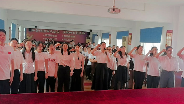 青年教师重温入职誓词,坚定而清澈的誓言回荡在会场中,展现出新一代教育者的决心与力量。