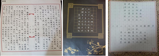 五六年级以“写规范字”为核心,开展“普通话+规范字”书法作品提交活动。学生们围绕“推广普通话”“我爱中国话”等主题,书写古诗、名篇。作品中,每个汉字笔画工整、结构匀称,既展现了学生扎实的书写功底,又传递了“说好普通话、写好规范字”的理念。