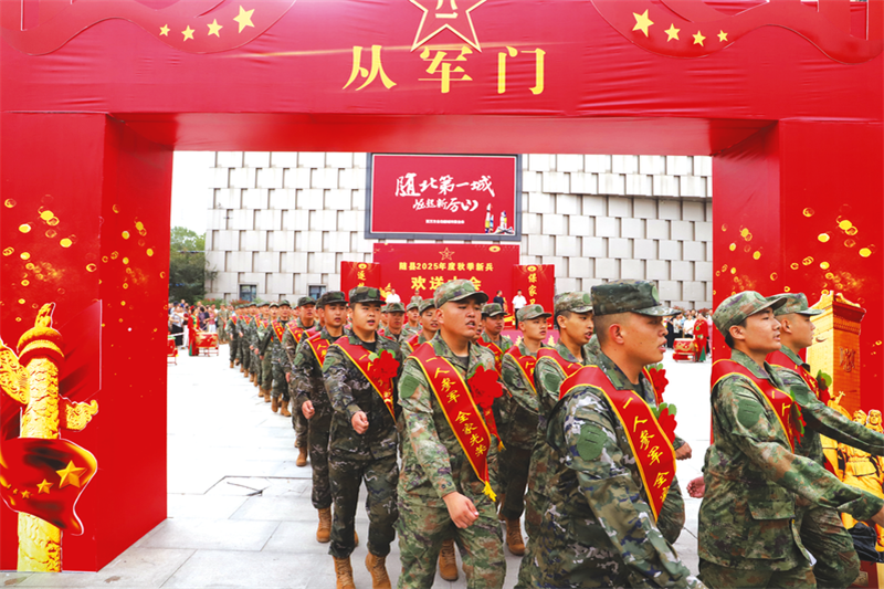 9月16日,随州市2025年秋季新兵启运工作拉开帷幕,随州热血青年带着家乡父老的嘱托,踏上逐梦军旅的征程,担负起保家卫国的光荣使命。图为随县欢送即将奔赴军营的新兵。