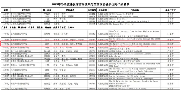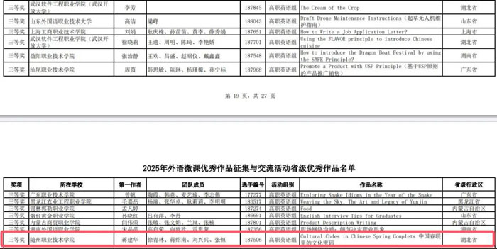 随州新闻网讯 (通讯员蒋建华、黄新、彭冬梅)近日,从高等教育出版社主办的“2025年外语微课优秀作品征集与交流活动”组委会获悉,随州职业技术学院公共课部外语教研室两个教师团队在省级评审中喜获佳绩:黄新教师团队荣获高职英语组一等奖并成功晋级国赛,蒋建华教师团队荣获三等奖,创下学校在该项赛事中的新佳绩。