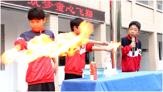 随即,令人期待的科学表演环节登场。六(3)班的 “火云掌” 实验表演率先亮相,他们将经过特殊处理的泡沫覆盖掌心,点火后橘红色火焰在掌心 “跳跃”,却丝毫不会烫伤皮肤,同学们纷纷惊呼 “科学太神奇了”;六年级(2)班的 “彩虹泡泡龙”也精彩,同学们用自制工具吹出连绵不断的彩色泡泡,在阳光下折射出七色彩光,直观展现了光的折射现象;六年级(1)班的 “法老之蛇” 实验中,粉末燃烧后逐渐炭化,“生长” 出棕黑色的蛇状物质,让现场响起阵阵惊叹;六年级(4)班的 “火山喷发” 更具视觉冲击力,模拟岩浆的红色液体顺着 “火山口” 涌出,生动诠释了化学反应的奇妙。