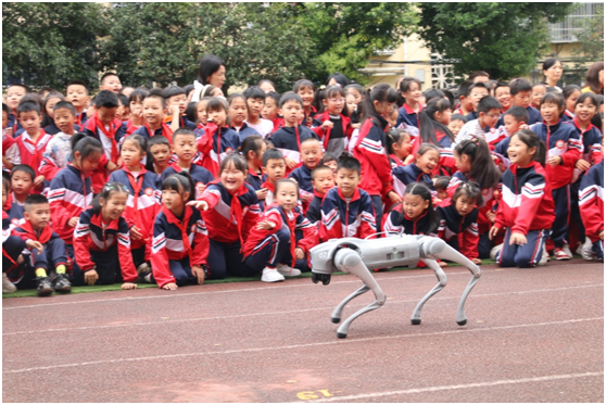 而科大讯飞带来的机器狗表演则成为开幕式上的 “压轴大戏”。这只银灰色的四足机器人刚登场,就以灵活的步态引来满场的欢呼声。 它时而原地转圈,时而悠闲漫步,接到指令后还能精准完成跳跃、翻滚等高难度动作,它主动走到学生中间互动 “握手”,让全场同学掌声与尖叫声此起彼伏,同学们纷纷伸出手想要触摸这只 “科技萌宠”,真切感受到人工智能的魅力。