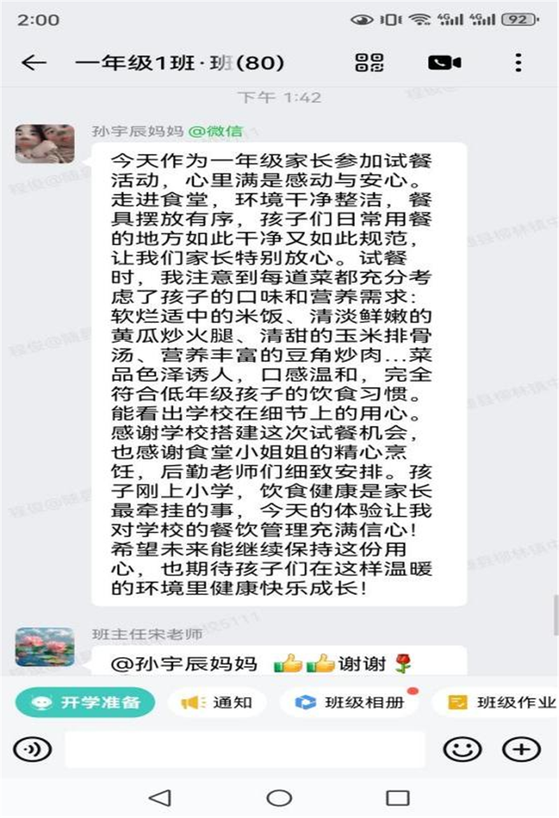 在学校食堂,家长们代表依次查看了供应商信息和原材料采购价格公示,并深入储藏间、操作间等区域进行查看。随后,学校领导和家长代表们共同进餐,让家长更直观的了解学生日常用餐情况。餐后家长们填写了评餐记录。一年级家长代表孙宇辰妈妈:“今天作为一年级家长参加试餐活动,心里满是感动与安心。走进食堂,环境干净整洁,餐具摆放有序,孩子们日常用餐的地方如此干净又如此规范,让我们家长特别放心。试餐时,我注意到每道菜都充分考虑了孩子的口味和营养需求:软烂适中的米饭、清淡鲜嫩的黄瓜炒火腿、清甜的玉米排骨汤、营养丰富的豆角炒肉…菜品色泽诱人,口感温和,完全符合低年级孩子的饮食习惯。能看出学校在细节上的用心。感谢学校搭建这次试餐机会,也感谢食堂厨师的精心烹饪和后勤老师们细致安排。孩子刚上小学,饮食健康是家长最牵挂的事,今天的体验让我对学校的餐饮管理充满信心!希望未来能继续保持这份用心,也期待孩子们在这样温暖的环境里健康快乐成长!”