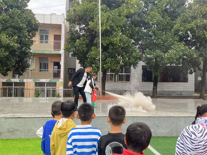 随着消防警报声响起,各班学生迅速用手捂住口鼻,在教师引导下弯腰低姿、沿着预定路线有序撤离。楼道内,引导教师时刻提醒学生注意脚下安全,避免滑倒。在灭火器实操环节,章校长细致讲解灭火器的使用步骤,并现场演示扑灭模拟火源。在老师的鼓励下,多名学生踊跃上台尝试。他们按照“一提、二拔、三握、四压”的要领,成功扑灭燃烧物。尽管雨水打湿了脸庞,学生们学习消防技能的热情却丝毫不减。