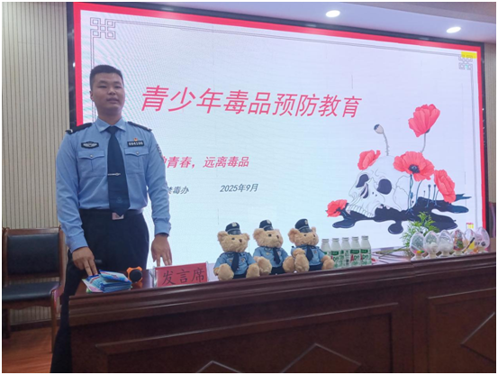 活动中,县公安局禁毒大队民警为同学们带来了一场内容详实的禁毒知识讲座。通过真实案例、短视频和图片数据,民警系统讲解了毒品的种类、危害及预防方法,重点揭示了新型毒品的隐蔽性和欺骗性,引导学生树立正确防范意识。